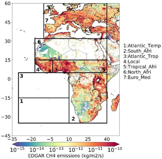Regions selected for dimension reduction prior to the application of the clustering algorithm. Anthropogenic CH4 emissions for 2015 from the EDGAR v5.0 database with a spatial algorithm. All main anthropogenic sources, e.g., waste treatment, industrial and agricultural sources, are included. Selected regions were: Temperate Atlantic (here Atlantic_Temp); South Africa (here South_Afri); Atlantic Tropical (here Atlantic_Trop); local; Tropical Africa (here tropical_Afri); North Africa (here North_Afri); Europe-Mediterranean (here Euro_Med). The star (in black) in the local area indicates the sampling location.