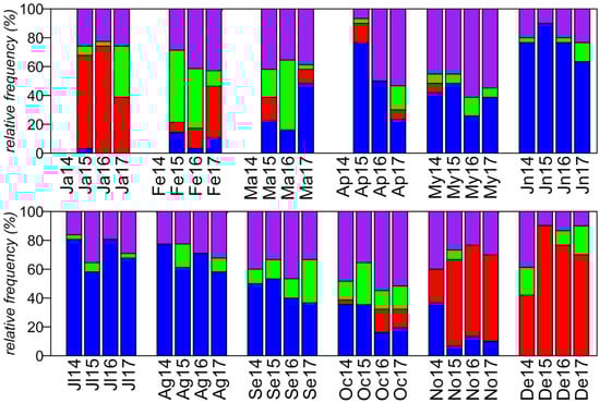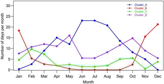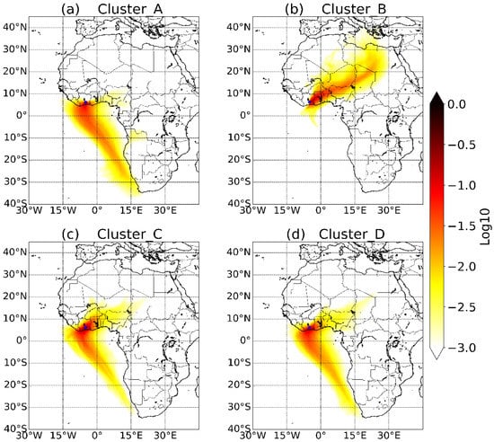 Figure 11 shows the seasonal frequency for each of the four clusters. Clusters A and B represent two opposed poles of atmospheric transport patterns. Thus, we observed that these two clusters are much more frequent (at least 50% of the data) from June to September for cluster A, and from November to January for cluster B. The meteorological situations which correspond to the occurrences of these clusters are marked by the presence of the Saharo–Libyan anticyclone (strong activity in December to February) for cluster B and the Saint-Hélène anticyclone (strong activity in April to September) for cluster A. Monsoon flows are frequent from May to September [63,64], consistent with the seasonality of cluster A. Cluster B is sensitive to the advection of air masses due to Harmattan flows [19,65]. On the other hand, cluster C shows peaks (February–March and October) which are observed during changes in rainfall regimes at Lamto (i.e., from dry season to wet season and wet season to dry season). Cluster D is ubiquitous throughout the year with significant peaks observed in May and October, corresponding to the months when the station records significant peaks of precipitation (Figure 2) [36].