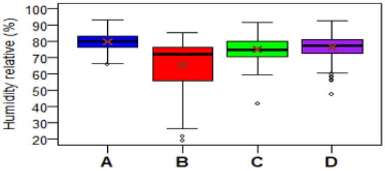 With the clustering of the PESs being independent of the observed concentrations, the statistical separation of the concentrations between the different clusters is interpreted as confirmation of the influences of the source air mass and associated surface flows. Figure 7, Figure 8 and Figure 9 show, respectively, the average PES for each cluster and box plots of the median and interquartile range of Relative Humidity and CO2, CH4 and CO concentrations associated with each cluster. In addition, Table 2 reports the correlations between CO2, CH4, and CO atmospheric concentrations and PES within each of the four clusters (Figure A1). The correlation coefficients between the trace gases and PES are positive and significant for all the clusters, except cluster A, which presents, by contrast, negative and insignificant correlation values. High (R > 0.5) and significant (p-value < 0.001) correlations in clusters B, C, and D indicate that the transport-related factors controlling CO2, CH4, and CO variabilities could be the same, especially as their trends evolve synchronously.