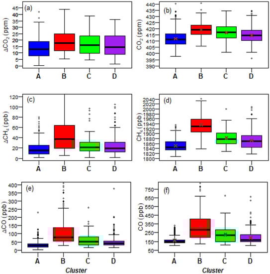 Cluster C’s main area of particle residence is common with cluster A. However, air masses classified in cluster C originate from two privileged directions: south (trajectory of Atlantic origin) similarly to cluster A, and east (trajectory of continental origin), conferring it a “mixed” status. It is specifically related to strong local influences reflected by a high residence time nearby the station (dark red in Figure 7c). Unlike other clusters, it is more sensitive to air masses from all directions. Only 11% of data are associated with this cluster. Air masses have median CO, CO2 and CH4 concentrations of 221, 417, and 1879 ppb respectively, lower than the observations in cluster B, C most likely due to the presence of marine air masses. However, these median concentrations are higher than the average (see Section 2.4). This cluster shows an excess above background levels of ≈68 ppb for CO, ≈4 ppm for CO2 and ≈22 ppb for CH4. The values of the correlation coefficient between CO and CH4, and between CO and CO2 are high (R > 0.60) and significant (p-value < 0.001) in this cluster. These strong correlations indicate that the factors controlling emissions and variability of these species could be similar.