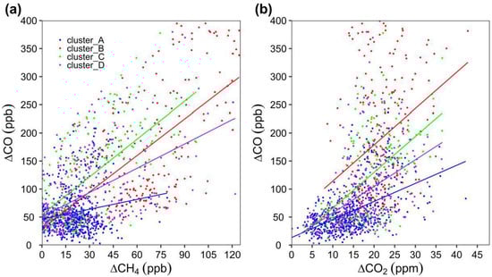 Scatter plots and linear regression for each of the clusters (a) between ΔCO and ΔCH4, (b) between ΔCO and ΔCO2.