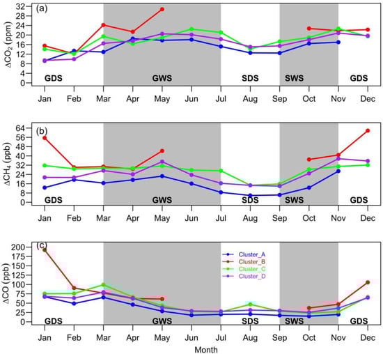 Annual cycles of excess concentrations of (a) CO2, (b) CH4, and (c) CO associated with each cluster.