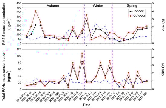 The blue dotted line in Figure 1 shows the ratio of indoor PM2.5 or PAH concentration to outdoors (I/O ratio) [34]. The I/O ratio directly represents the relationship between indoor and outdoor concentrations, which is easy to understand and widely used [35].