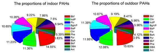 Descriptive statistics on the analyzed 12 PAH species both indoor and outdoor are presented in Figure 2. According to correlation analysis by SPSS, there was a statistically strong positive correlation between indoor and outdoor PAH species sequence, with a correlation coefficient of 0.86 (p < 0.01), indicating the significant impacts of outdoor PAHs on indoors.