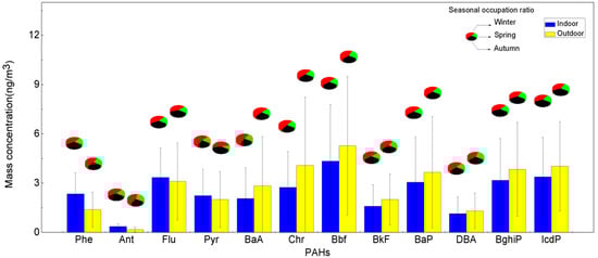 Obvious seasonal variations of PAH species are presented in pie charts in Figure 3. In general, for both indoors and outdoors, the highest concentrations occurred in winter, with lower levels in autumn, and the lowest in spring.