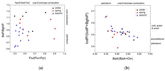 The diagnostic ratio method was used in this study for preliminary identification of possible indoor PAH sources, including IcdP/(IcdP + BghiP), BaA/(BaA + Chr), Flu/(Flu + Pyr) and Bap/BghiP. Figure 4a,b shows the scatter plot for BaP/BghiP vs. Flu/(Flu + Pyr) and IcdP/(IcdP + BghiP) vs. BaA/(BaA + Chr) with different seasons, respectively. As shown in Figure 4, for indoor PAHs, automobile exhausts, fossil fuel combustion and biomass combustion source were the major contributors. The BaP/BghiP ratios of all samples were higher than 0.6, suggesting a significant vehicle atmospheric environment, and, especially in autumn, petroleum played a domination role according to the BaP/BghiP ratio [55,56]. The Flu/(Flu + Pyr) ratio can further identify diesel vehicle sources (0.6–0.7), indicating a mixed-traffic source of indoor PAHs. The ratios of BaA/(BaA + Chr) in most samples higher than 0.35 suggest that the combustion is also a primary source [30].The value of IcdP/(IcdP + BghiP) lower than 0.5 was regarded as an indicator of a petroleum source, while exceed 0.5 was distinguished as a coal, grass and wood combustion source [57]. In addition, ratios of Flu/(Flu + Pyr) around 0.5 suggested a liquid fossil fuel source, while Flu/(Flu + Pyr) > 0.5 was the mark of coal and biomass combustion [58,59].