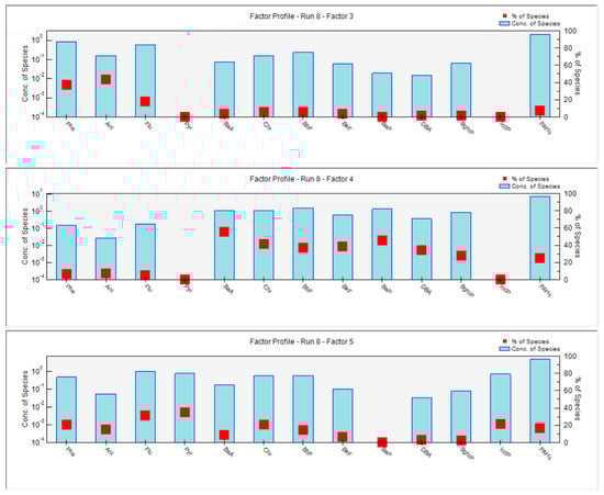 For further investigation of PAH source apportion and contribution, the PMF model analysis was conducted, and the primary sources’ contributions to the total indoor PAHs are as shown in Figure 5. There were five identified PAH sources.