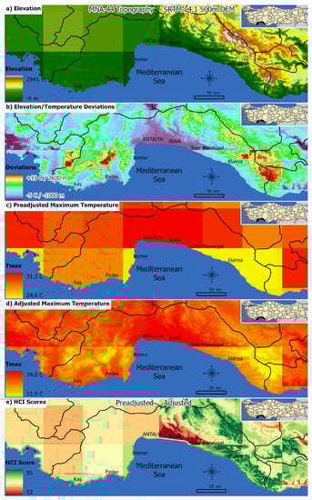 Showcase (Antalya Province, Turkey) of DEM-based lapse rate adjustments on the Summer (1971–2000) maximum temperature outputs. (a) MNA-44 Topography vs SRTM v4.1 500 m Elevations (b) Elevation/Temperature Deviations (c) Preadjusted Maximum Temperature (d) Adjusted Maximum Temperature (e) MNA-44 Topography vs SRTM v4.1 500 m HCI Scores.