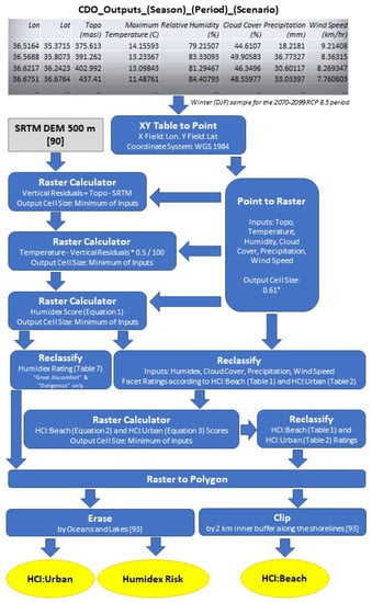 Stages of the Batch Geoprocessing Model Workflow on CDO Outputs for the HCI Variables. The model is iterated for each dataset representing different seasonal averages, periods and scenarios.