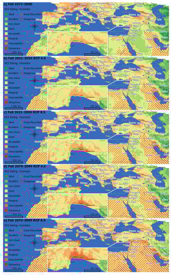Fall season Holiday Climate Index (HCI) ratings and Humidex risks in the greater Mediterranean region for the projection periods (a) 1971–2000 (b) 2021–2050 (RCP 4.5) (c) 2021–2050 (RCP 8.5) (d) 2070–2099 (RCP 4.5) (e) 2070–2099 (RCP 8.5).