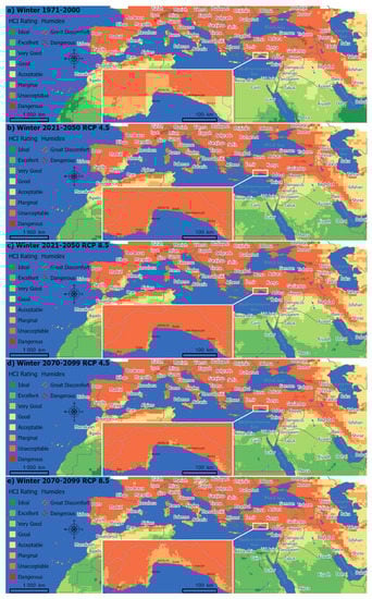 The final HCI scores are computed with weighted sum analyses based on the Equations (2) and (3) in the original articles [,], with the output cell size set to the 500 m resolution of the Thermal Comfort layer. The scores are further reclassified according to the identical HCI rating schemes on Table 1 and Table 2. It should be noted that the original articles state an HCI score range between 0 and 100 while extreme cases according to the equations, as well as the results of this study, do yield some negative scores. In this study, these extreme cases are also rated as “dangerous” for tourism. Moreover, “great discomfort” and “dangerous” ratings of the Humidex layers [] are also visualized to set the stage for risk discussion from both HCI and apparent temperature perspectives. The final results are organized as separate figures (Figure 3, Figure 4, Figure 5 and Figure 6) for each of the four seasons. Each figure portrays the five periods for the greater Mediterranean extent with an inset for the case of Antalya. HCI:Urban ratings cover the entire lands while HCI:Beach ratings are clipped along the 2 km wide shorelines of seas (including some minor islands) and major lakes, as digitized by Natural Earth [].