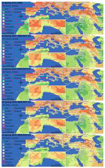 Spring season Holiday Climate Index (HCI) ratings and Humidex risks in the greater Mediterranean region for the projection periods (a) 1971–2000 (b) 2021–2050 (RCP 4.5) (c) 2021–2050 (RCP 8.5) (d) 2070–2099 (RCP 4.5) (e) 2070–2099 (RCP 8.5).