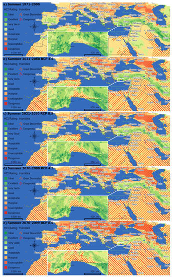Climate indices have been developed to assess the potential present and future climatic attractiveness of destinations for tourism. These indices, the first of which was the Tourism Climate Index (TCI) [], combine and score climatic components that are significant for tourist comfort such as temperature, humidity, precipitation, cloud cover, and wind speed, according to their suitability for human-environment systems. In this study, an improved version of TCI, Holiday Climate Index (HCI) [,] for beach and urban tourism is used to assess the climatic performance of various destinations in the greater Mediterranean region throughout the 21st century and under different representative concentration pathways (RCPs). The underlying spatial extent and projections complement a Caribbean beach tourism study [] with a Mediterranean perspective and significantly update the former A1B emissions scenario of the IPCC’s Special Report on Emission Scenarios [] on the urban case [] with two of the latest greenhouse gas concentration trajectories, RCP 4.5 and 8.5 [].