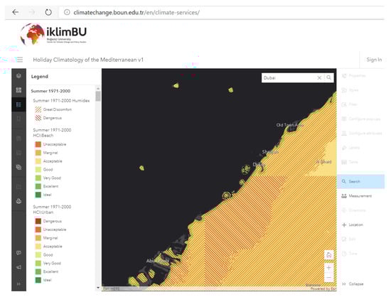 As the breadth of results from climate modeling—geoprocessing chain is extensive, a basic climate information service, Holiday Climatology of the Mediterranean (HCM), was created. Such platforms tailored for tourism stakeholders are on the rise, despite the initial challenges to their use [], and already some macro-regional products [,,] are being launched. In this first version of the HCM, all 60 layers (4 seasons, 5 periods, 3 indices) in Figure 3, Figure 4, Figure 5 and Figure 6 were shared within a web map with a visualization configuration that enables fast rendering by using pre-generated tiles, hosted by Umeå University’s ArcGIS Online (AGOL) organization. The three index layers were integrated per period and scenario and further aligned in AGOL Map Viewer Beta and embedded into iklimBU’s web site [] to provide a public interface (Figure 7) where any user can zoom into or search her/his place of interest, according to ArcGIS World Geocoding Service, overlaid with index ratings, and toggle, move or transparentize layers.