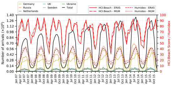 Besides its significant climate-dependent tourism economy and data availability for validation, Antalya makes a useful case as it sits in between high HCI ratings and Humidex risks (see Figure 6). At a first glance, the monthly visits from the primary source markets to Antalya do not seem to be best explained by the HCI:Beach, but the Humidex, for the 2007–2015 period (Figure 8). Under HCI:Beach approach, a sudden decrease is easily noticed for the two peak months of July–August, while most visits seem to follow the Humidex trends well. Indeed, regression analysis results (Table 3) show that total arrivals to Antalya are best explained by Humidex or maximum temperature values while the coefficient of determination for Thermal Comfort Rating is among the lowest, and even insignificant when based on MGM data. This misfit stems from the Thermal Comfort rating scheme of HCI:Beach (see Table 1) that favors a 28–31 Humidex range as the highest rated and treats all values above 39 as too hot for beach tourism, based on the Caribbean experience []. In the case of Antalya, all observed July–August Humidex values in the 2007–2015 period exceed the 39 break with an average of 40.7, while visitation is maximized.