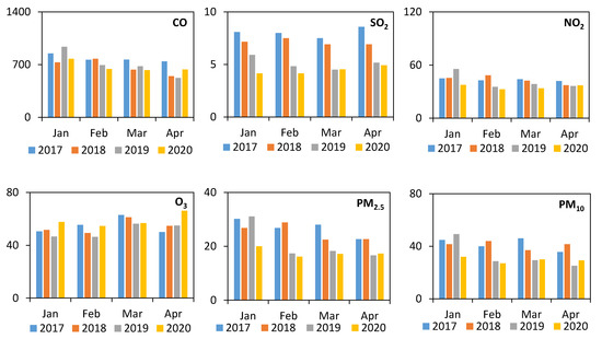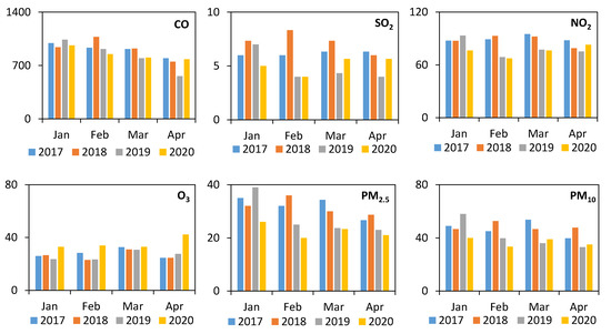 Figure 1 showed the average pollutant concentrations measured at the 3 roadside air quality monitoring stations during January–April in 2017–2020. The month-to-month variations were relatively large and there was no clear variation tendency from January to April for each year from 2017 to 2020, due to the changes in meteorological conditions. This indicates that a simple comparison of COVID-19 period (i.e., January 2020) vs. pre-COVID-19 period (i.e., February–April 2019) would lead to a random conclusion on the effect of COVID-19 on air quality. Therefore, comparing 2020 data with 2017–2019 data in the same month (Table 2) is more reliable due to the smaller difference in meteorological conditions. Generally, the 2020 CO, SO2, NO2, PM10 and PM2.5 concentrations showed reductions when comparing with the 2017–2019 data, except for a few comparisons such as NO2 in April 2019 and April 2018 which were actually slightly lower than the corresponding 2020 data. Specially, the emissions in April 2020 were generally higher than the previous year, although the human emission activities were reduced in April 2020 due to the COVID-19 social distancing. This increase may be because the meteorological conditions were not favorable for air movements and pollutants dispersion, thus resulting in the higher pollutant concentrations observed. As shown in Table 2, during the pre-COVID-19 period (i.e., January), 2020 data showed reductions of −2% to 7% for CO, 17% to 32% for SO2, 13% to 18% for NO2, 14% to 31% for PM10, and 19% to 33% for PM2.5 when comparing with 2017–2019 in the same month. While during the COVID-19 period (i.e., February–April), 2020 data showed reductions of −40% to 21% for CO, −42% to 52% for SO2, −10% to 28% for NO2, −8% to 37% for PM10, and 1% to 44% for PM2.5. Finally, O3 was the only pollutant that was constantly higher in 2020 than that in 2017–2019, with 24% to 39% higher in pre-COVID-19 period and 1% to 72% higher in COVID-19 period.