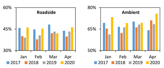 Finally, both roadside and ambient O3 concentrations in 2020 were higher than those in 2017–2019. This is because O3 is a secondary air pollutant which is formed through photochemical reactions of gaseous precursors (mainly NO2 and volatile organic compounds (VOCs)) in the presence of sunlight. Higher O3 emissions were usually observed with NO2 reductions which could have changed O3 formation from VOCs sensitive regime to mixed sensitive regime, as reported in previous studies [18,20]. Since NOx (i.e., NO + NO2) are involved in both the formation and reduction of O3, the net formation of O3 is actually determined by the ratio of NO2/NOx [18]. Figure 3 shows the average NO2/NOx ratios at both the roadside and ambient stations during the studied period. Generally, NO2/NOx ratios were higher in April 2020, which explained the higher O3 concentrations observed.