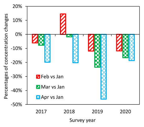Percentages of roadside CO concentration changes of COVID-19 period (i.e., February–April) relative to pre-COVID-19 period (i.e., January) for each year.