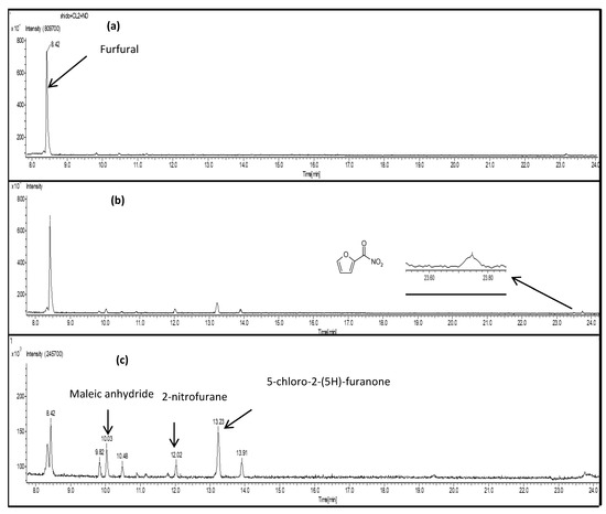 H)-furanone (P1), respectively. The peak at 12.02 min was identified as being due to 2-nitrofuran. The assignment was confirmed by comparing the retention times and mass spectra with those of commercial samples: 2-nitrofuran and maleic anhydride. For the identification of 5-chloro-2-(5