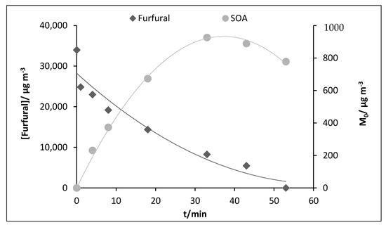 The decay of furfural versus the variation of SOA mass (M