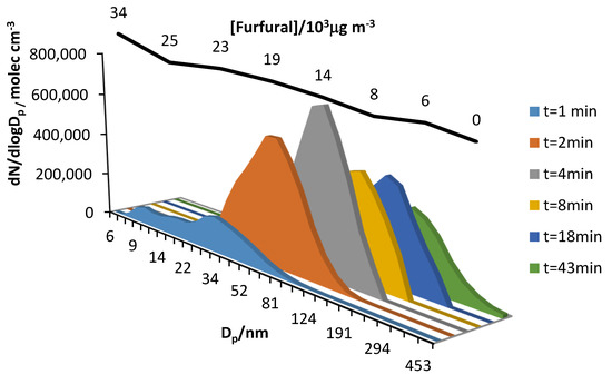 In the reaction of furfural with the OH radical, particles were formed by irradiation of the precursor mixture (CH3ONO and NO) with visible lamps in air. The concentration and particle size observed under the same experimental conditions were lower than those obtained in the reaction with chlorine atoms. In this reaction, due to the formation of preexisting ultrafine particles from the degradation of the OH precursor, it is believed that these act as condensation nuclei that promote the growth of the particles in this process. However, the existence of a nucleation process cannot be dismissed.