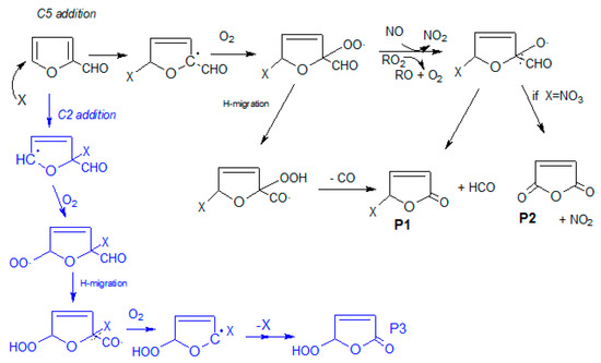 The formation of 2-furylnitroketone and 2-nitrofuran (P5) can be explained by the reaction between the intermediate radicals generated and NO