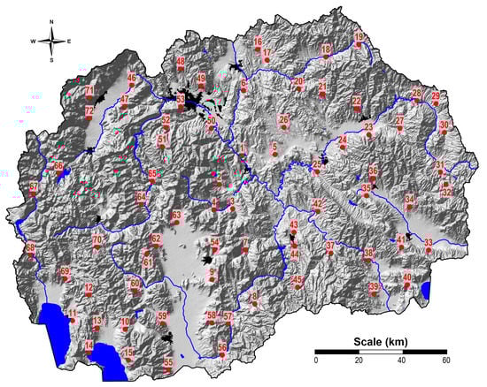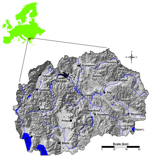 The Republic of Macedonia is situated in the central part of the Balkan Peninsula (Figure 1) with an area of 25,713 km2 between latitudes 40° and 43° N and between longitudes 20° and 23° E. Geographically, the investigated area is clearly defined by a central valley formed along the Vardar River, which is surrounded by mountain ranges. The country boasts 16 mountains higher than 2000 m, although most of its area lies between 500 and 1000 m. The lowest point (44 m) indicates an area on the cross point of the Vardar River; the highest point (2764 m) is the peak of Korab mountain [51]. Most of the population (2.057 million), lives in urban areas, and more than a quarter live in the capital city of Skopje [52].