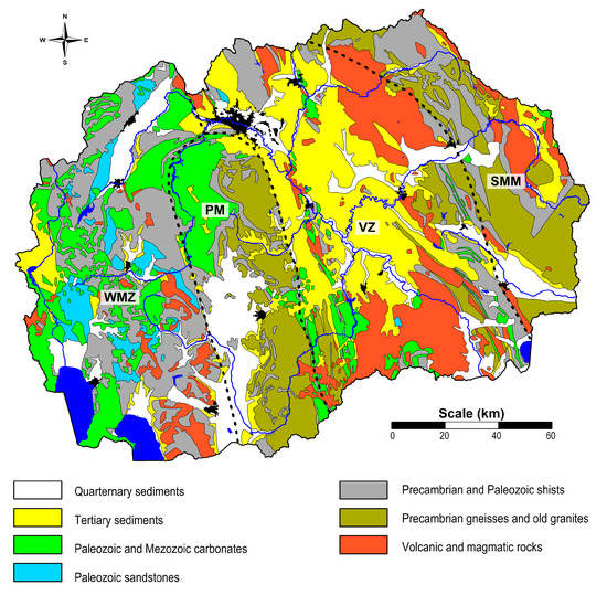 Macedonia is constituted by several geotectonic units that were formed during different geological periods; these are generally spread out in NNW-SSE to N-S direction [44,59]. Contacts of units are marked by regional faults managed by the Laramide compression (Laramide orogeny phase) [44]. The country lies on four major tectonic units (Figure 2): The Serbo-Macedonian massif (SMM), the Vardar zone (VZ), the Pelagonian massif (PM), and the West-Macedonian zone (WMZ) [60,61]. The SMM and PM form the oldest complexes in which highly metamorphic Proterozoic rocks have developed; the area is characterized by widespread Riphean-Cambrian, Paleozoic, Mesozoic, and Cenozoic rocks [44]. The WMZ is lithologically composed of low-grade metamorphic rocks, and anchi-metamorphic Paleozoic rocks and migmatites, Triassic and Jurassic sediments, and migmatites, and Tertiary sediments [44]. The VZ is a large and important lineament structure of the Balkan Peninsula [61]; it represents an area where a continuous thinning of the continental crust had occurred, and where, during the Lower Jurassic, it completely transited into the rift zone [44].