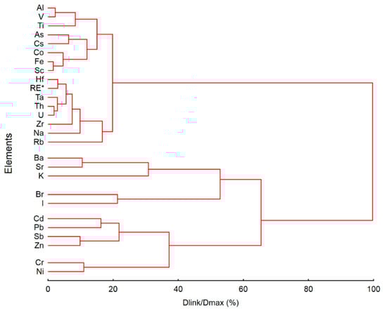 Based on the matrix of correlation coefficients, multivariate cluster, and R-mode factor analysis, the associations of chemical elements were revealed [70,71,72]. In this case, the values in a range of 0.5 to 0.7 were a good association, while the values in the range of 0.7 to 1.0 were a strong association. The multivariate statistical cluster and factor analyses were performed on 27 selected elements (Al, As, Co, Cs, Fe, Hf, Na, Rb, Sc, Ta, Th, Ti, U, V, Zr, Cd, Pb, Sb, Zn, Cr, Ni, Ba, K, Sr, Br, I, and rare-earth elements (RE)). Some elements were excluded from the analysis because they did not show a sensible connection with other chemical elements, or did not satisfy the criteria of dimension variables based on several observations. For factor analysis purposes, the variables were standardized to a zero mean [70,71,73]. Subsequently, based on characteristics of the 27 individual elements, five synthetic variables were designed (Factor 1—F1 to Factor 5—F5), which account for 81.8% of the total variability of the treated elements. The variables with factor loadings higher than 0.6 were assumed to contribute significantly to a given factor.