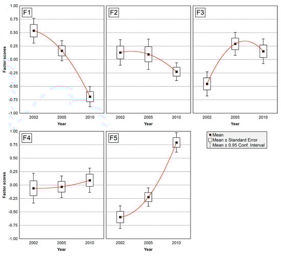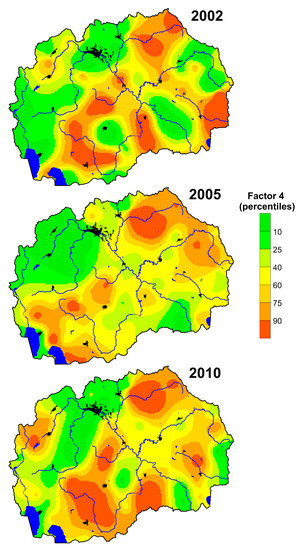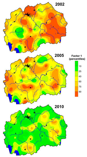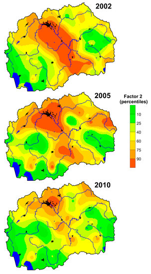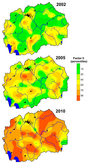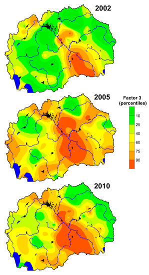 The obtained factors were also compared according to the sampling campaigns (2002/2005/2010) (Figure 5). The largest changes were observed in Factor 1 and Factor 5. Factor 1 falls sharply according to the sampling campaign; the opposite trend is observed at Factor 5. Both factors illustrate the geogenic association of chemical elements, which is related to the climatic variables. Factor 3 follows a concave pattern with the highest values obtained in 2005, which coincides with the reactivation of the ferronickel smelter in Kavadarci in 2004. Factor 2 slightly declined, which can be related to the closure of Pb-Zn mine in Veles in 2003. The geogenic association Factor 4 shows almost no changes, which means there were no significant natural changes.