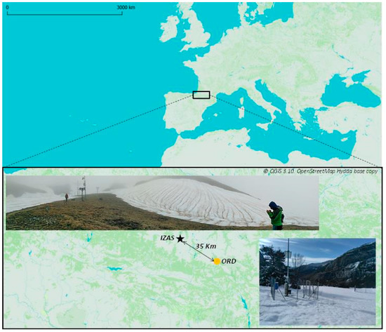 Location of the study area, situation of the monitoring sites (Izas and Ordesa and Monte Perdido National Park-ORD) and photos of the monitoring sites. Photos taken by J. Pey: Izas (upper part), on 29 May 2018; Ordesa (bottom part), on 9 January 2018.