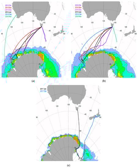 Colour-coded ship tracks for each month during the voyages of (a) RSV Aurora Australis over the period October 2015 to March 2016, (b) RSV Aurora Australis over the period October 2018 to March 2019 and (c) MS The World over the period of January to February 2017. The contours of sea ice fraction (0.2, 0.4, 0.6, 0.8, 1.0) are overlaid in different colours based on NOAA Optimum Interpolation Sea Surface Temperature version V2 data. The sea ice concentration data have been averaged over November 2015 to February 2016 for (a), over November 2018 to February 2019 for (b), and over January 2017 for (c).