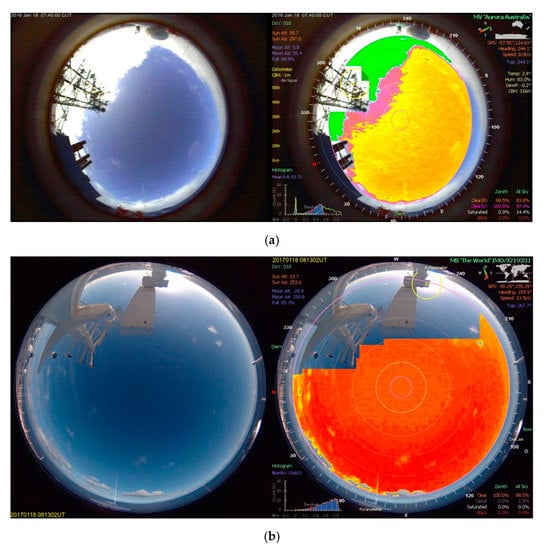 As the aim of the research was to investigate the influence of local conditions on the radiation environment during daytime, we used a version of common blue-red pixel ratio and differencing methods to differentiate clear sky and cloudy pixels, and sum pixel counts to determine a cloud fraction for each image recorded during the day (solar elevation > 5°). Variants of these methods have been described previously [34,35,36,37,38]. For our pixel ratio method (blue channel divided by red channel; BdR) a threshold of 1.3 was applied to the 8-bit (0–255) blue/red components to distinguish blue (clear sky) pixels. The threshold is camera-dependent (determined by image processing and colour saturation settings) and tailored for general sky conditions (depending on sky brightness, Rayleigh scattering and van Rhijn effects) and was set based on visual inspection of a wide range of images to provide a reasonable discrimination over clear, cloudy and overcast conditions [31]. Figure 3 shows an example of the image processing for two different cameras. Raw images are shown on the left. Detected clear sky pixels are false coloured using a red-yellow scale overlaid on the image on the right. The saturated pixels (all red-green-blue (RGB) channels > 245) and black pixels (all RGB channels < 5) were not included in the pixels counts and are false coloured lime green and brown, respectively. For comparison, the blue-red pixel difference metric (BmR) was also adopted, and pixels with BmR over a threshold of 30 were classified as clear-sky pixels. Those pixels classified as clear-sky by the BmR method but not detected by the BdR method are false coloured using a red-purple colour scale. As in Klekociuk et al. [31], we evaluated the cloud fraction (as the fraction of pixels containing cloud in the total available pixels unaffected by saturation or containing parts of the ship) in a “zenith” region (the 8° diameter region centred in the zenith) and an “all-sky” region.