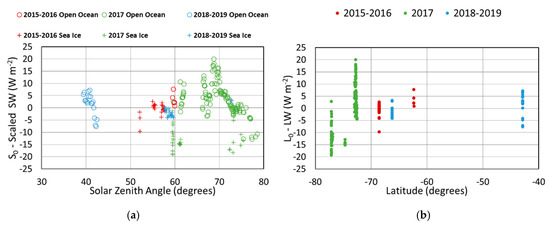 The retained clear-sky short-wave measurements were evaluated in comparison with the total downwelling solar irradiance provided by the R subroutine “insol” [50,51], version 1.2.2. As input to the model we used the observed temperature and humidity, the surface albedo α as used in Equation (4) and an assumed ozone column thickness (at standard temperature and pressure) of 3 mm. We separately regressed the observed SW irradiance against the modelled SW irradiance for each measurement season. There was excellent consistency between the measurements and model over a wide range of solar zenith angles in both open ocean and sea-ice conditions. Details of the regressions are provided in Table 1. Differences in the slope of the regression are ascribed to the influence of the ship’s superstructure on the amount of diffuse irradiance measured. From camera images, the fraction of sky obscured for the irradiance measurements was previously estimated as 12% and 3% for the Kipp and Zonen and Underway sensors, respectively on RSV Aurora Australis [13,31], and we obtained 15% for MS The World. The coefficients in Table 1 for RSV Aurora Australis are consistent with the expected obscuration by the superstructure of the diffuse solar clear-sky radiation (which was typically 10 to 30% of the total irradiance depending on solar zenith angle and latitude). This demonstrated that the modelled global clear-sky irradiance did not have an obvious bias (under the reasonable assumption that the sensor calibrations were accurate). The regression coefficient in Table 1 for MS. The World is greater than unity; this is because the superstructure produced an effective enhancement in the diffuse irradiance because of its relatively high albedo (as can be seen in comparison with RSV Aurora Australis in Figure 3). We checked clear-sky situations when the sun was directly behind the ship’s structures as seen from the pyranometer. The measured irradiance in this situation was of the diffuse component. This was on-average enhanced by a factor of 1.02 relative to the modelled diffuse radiation. As this was similar to the enhancement in the case of direct sun, we expect all measurements to be enhanced, with the coefficient provided in Table 1 providing an upper limit to the magnitude of the effect. In order to correct for the separate effects of the surrounding superstructure in each season, we divided the measured short-wave irradiance by the relevant coefficient m in Table 1 to provide a scaled value. This was done under the assumption that the modelled global clear-sky irradiance provided an appropriate estimate of S0. The residuals from the regressions are shown in Figure 4a.