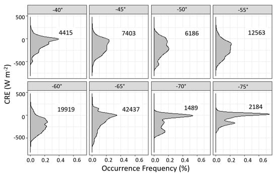 Histograms of 1-min averaged cloud radiative effect (CRE) as a function of percentage occurrence for different latitudes in 5-degree bands. The data are from all voyages. The latitude of each band-centre (degrees) is indicated at the top of each plot and the total number of 1-min observations in each latitude band is indicated in each panel.