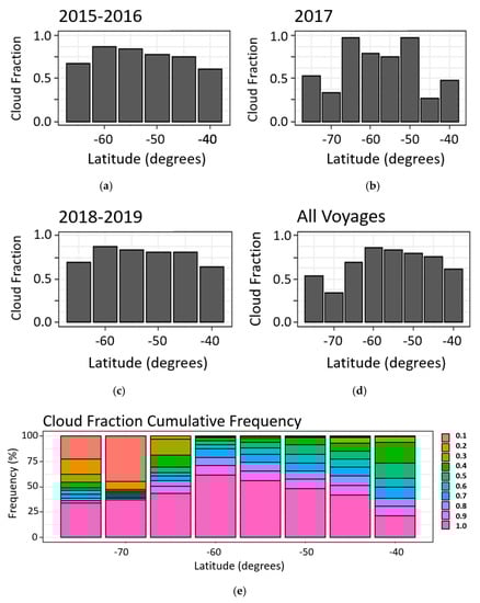 The average cloud fraction (%) in 5-degree latitude bands for (a) the 2015 to 2016 voyages, (b) the 2017 voyage, (c) the 2018 to 2019 voyages, (d) over all voyages and (e) over all voyages but shown as a cumulative frequency distribution.
