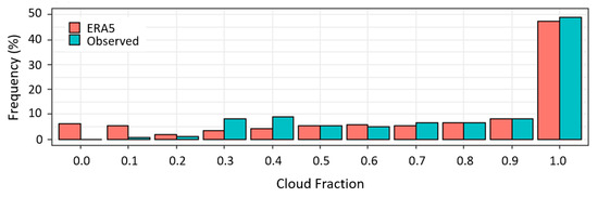 In Figure 7, the frequency distribution of cloud fraction is shown for the observations and the interpolated ERA5 data. Over 50% of the observations had a cloud fraction greater than 0.9 and only 5% of the observations had a cloud fraction less than 0.2, which is similar to the results of Fitzpatrick and Warren [13]. In comparison, ERA5 showed a positive bias for the occurrence of cloud fractions less than 0.3, and a negative bias for cloud fractions of 0.3 and larger, including overcast conditions. Overall, the 1-min mean observed cloud fraction of 0.75 (σ = 0.28) was slightly higher than 0.70 (σ = 0.35) obtained from the interpolated ERA5 data.
