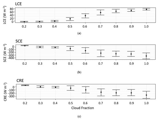 (a) Long-wave cloud radiative effect (LCE), (b) short-wave cloud radiative effect (SCE), and (c) net cloud radiative effect (CRE) versus cloud fraction obtained from all observations. Medians are shown as filled dots and the bars span the interquartile range. The data are averaged in intervals of 0.1 and are centred at the upper limit of each bin (for example, the bin at 0.1 is the average for 0.0 to 0.1).