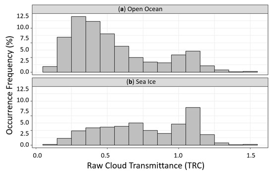 Frequency distribution of raw cloud transmittance (TRC) in percentage over (a) open ocean and (b) sea ice. Data are from all voyages.