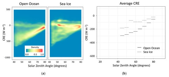 The frequency distribution of CRE as a function of the solar zenith angle is shown in Figure 10 for open ocean and sea ice conditions. For the open ocean, there is a general tendency for the more negative values of CRE to have a stronger dependence on solar zenith angle than for sea ice conditions. The lowermost boundary of the points in the panels of Figure 10a are similar to that obtained by Minnett [54] for a range of cloud types in the Arctic. Figure 10b separately shows the average CRE for open ocean and sea ice conditions in 5° solar zenith angle intervals. This shows that the CRE in the presence of sea ice is higher than for open ocean conditions. There is an approximate linear relation between CRE and solar zenith angle over open ocean under cloudy conditions which is less apparent over sea ice. For solar zenith angles of 50° to 60° a relatively concentrated amount of observations were made in the sea ice zone under generally cloud-free conditions, and this tends to make the average CRE significantly less negative than for the open ocean in this range of solar zenith angles. Additionally, the presence of icy rather than liquid cloud particles at the higher latitudes will tend to reduce the SCE by making the clouds more transparent [7]. When weighted by the duration at which the solar zenith angle is between the range for each bin shown in Figure 10b we obtained an average net CRE for observations over the open ocean as −199 ± 105 W m−2 and over sea ice as −113 ± 92 W m−2.