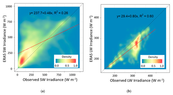 Comparisons of observations from ship-based sensors with ERA5 data interpolated to the location of the ship with occurrence frequency (density) scaled to 0–1 (blue to yellow to red). (a) SW irradiance. (b) LW irradiance. The scatterplots show linear regression equations and R2 correlation coefficients between the associated horizontal (x) and vertical (y) ordinates. The regression lines (solid red) and one-to-one line (dashed black) are also shown. Both the observed data and ERA5 data are at 1-min intervals.