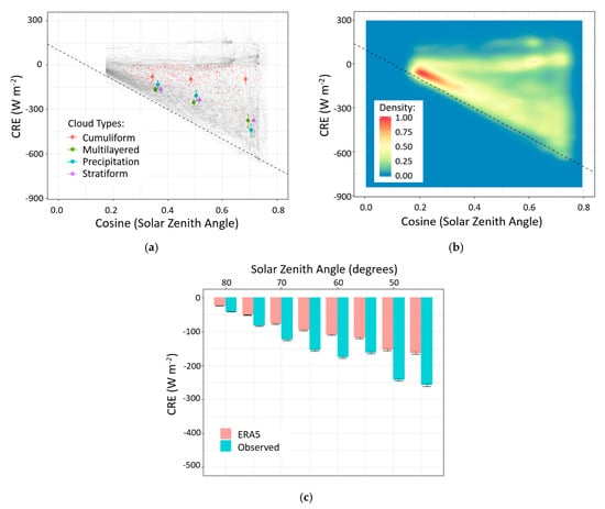 In Figure 12a we show the observed CRE as a function of solar zenith angle. The lower limit of CRE is approximately bounded by a linear function of the cosine of the solar zenith angle, as found by Minnett [54]. There is a tendency for values to lie below the dashed lower boundary in Figure 12a at the highest solar zenith angles, which could be a result of the perspective effect of the greater path length through clouds noted above. The upper range includes positive values, which is generally due to the radiation enhancement from broken cloud or the effects of sea ice when present. Figure 12b shows more clearly the reduced spread of measurements at large solar zenith angles (small cosine of solar zenith angle). In Figure 12a, we also show (as small red dots) 3-h averaged ERA5 data (rather than the interpolated 1-min data used in Figure 12b) which shows a similar distribution to the observations but with two differences. Firstly, values tend to be concentrated towards higher values unlike in the observations which is a consequence of ERA5 generally having less negative CRE. Secondly, the ERA5 data tend not to show positive CRE which could be due to the underestimation of the scattering effects in the presence of sea ice, or alternatively, if the model underestimates the radiation enhancement under broken clouds.