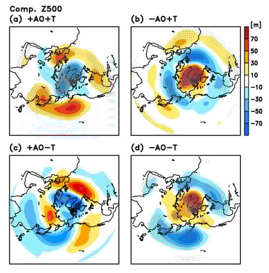 Composite maps of geopotential height anomalies at 500 hPa in winter season for (a) +AO+T, (b) −AO+T, (c) +AO−T, and (d) −AO−T group. Light (dark) gray dots denote grid points which satisfy 90% (95%) confidence level through the two-tailed Student’s T-test.