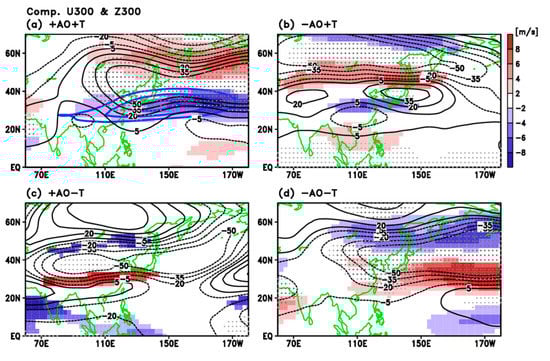 Composite maps of zonal wind (shading) and geopotential height (black contour) anomalies at 300 hPa in winter season for (a) +AO+T, (b) −AO+T, (c) +AO−T, and (d) −AO−T group. Blue contours in (a) indicate climatological zonal wind at 300hPa in winter season (larger than 40m/s with interval 10 m/s). Light (dark) gray contours denote boundaries of area which satisfy 90% (95%) confidence level through the two-tailed Student’s T-test. Zonal wind is shaded only for the grids which satisfy 90% confidence level.