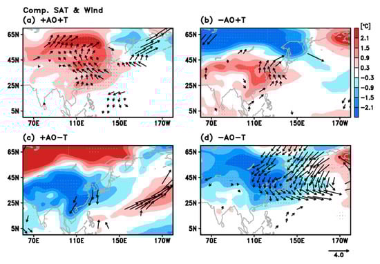 3.1. East Asian Circulation Features According to AO and SAT in South Korea
