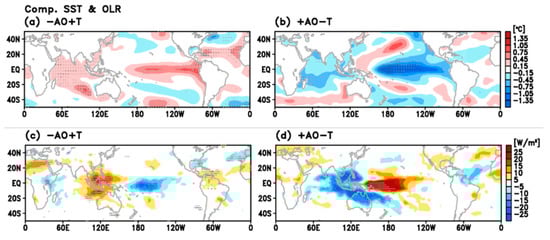 By comparing the zonal winds of in-phase and out-of-phase groups (Figure 3), notable differences can be found. In the in-phase group, the zonal wind anomalies are centered over the northwestern Pacific region expanding to East Asia, whereas those in the out-of-phase groups are located mainly over central China to Japan: a westward shift compared to the in-phase groups. Another difference can be identified over the subtropical western Pacific. The subtropical region in the in-phase groups lacks any significant anomalies; however, they can be observed over the subtropical western Pacific in the out-of-phase groups. This suggests the possibility of remote influences from the subtropical western Pacific on East Asia. This is further examined by composite analysis for SST and OLR, which represent convectional activities in the tropics and subtropics. In the in-phase groups, there are no significant SST anomalies in the tropics (Figure S1), whereas in the out-of-phase group, ENSO-like anomalies are pronounced in the tropical ocean. In the case of +AO−T, the SST anomalies show the typical negative ENSO-like pattern, which is characterized by the positive and negative SST anomaly in the central-eastern Pacific and western Pacific, respectively (Figure 5b). By contrast, the positive ENSO-like SST anomalies are prominent in the case of −AO+T (Figure 5a). These features related to ENSO are manifested in the composite of OLR anomalies. In the case of +AO−T(−AO+T), the negative (positive) and positive (negative) OLR anomalies are clearly found in the central Pacific and western Pacific, respectively. These features are well-known ENSO-related tropical convection patterns, which can play an important role in triggering a teleconnection toward mid-latitude regions [26,27,29,38]. Figure S2 shows the SST anomalies of the individual cases in the out-of-phase groups. In all four cases of +AO−T group, the SST anomalies commonly show a typical negative ENSO pattern characterized by the positive and negative SST anomaly in the central-eastern Pacific and western Pacific, respectively. In the −AO+T group, five out of eight cases show the prominent positive ENSO pattern, and two cases show the ENSO-like SST pattern, even though the Niño 3.4 index values indicate normal conditions. Only one case, January of 2014, shows the negative ENSO pattern. To summarize, the relevance of ENSO to the out-of-phase groups indicates that ENSO is closely linked to the modulation of the positive relationship between AO and SAT in South Korea.