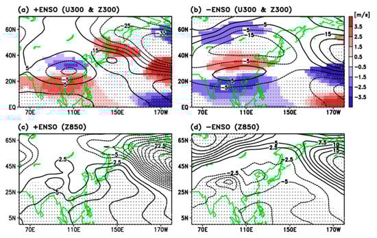 Composite maps of zonal wind (shading) and geopotential height (contours with interval 10m) anomalies at 300hPa in winter season for (a) +ENSO and (b) –ENSO. (c) and (d) are same as (a) and (b) but for geopotential height anomalies at 850hPa. Light (dark) gray dots denote grid points which satisfy 90% (95%) confidence level through the two-tailed Student’s T-test. Zonal wind in (a) and (b) is shaded only for the grids which satisfy 90% confidence level.