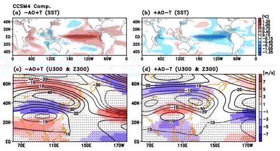 The ENSO modulation effect on the relationship between AO and SAT in South Korea was suggested by the observational analysis. To support this suggestion, we investigated the modulation effect in the CCSM4 historical simulation of CMIP5. Analogous with the observational analysis, the four groups of +AO+T, +AO−T, −AO−T, and −AO+T were categorized according to the SAT averaged over the Korean Peninsula (125° E–130° E and 32.5° N–40° N), and the AO index was calculated by the same method used in the observational analysis. The number of cases for the four groups detected in the model simulation were 62, 34, 48, and 32, respectively. As shown in the observations, the in-phase condition occurs more frequently than that of the out-of-phase. Figure 7 represents the SST and upper-tropospheric circulation anomalies in the −AO+T and +AO−T groups of the CCSM4 historical run. The results of this simulation support the observational analysis. As in the results of the observational analysis (Figure 5a), in the −AO+T group of CCSM4, the tropical SST evidently demonstrates a positive ENSO (Figure 7a), which is characterized by a positive SST anomaly from the central Pacific to the eastern Pacific and a negative SST anomaly over the western Pacific. Contrastingly, the negative ENSO characteristics are clearly seen in the +AO−T group (Figure 7b). Furthermore, the upper-tropospheric circulation anomalies (Figure 7c,d) exhibit similar features to those found in the observational analysis in the East Asian region (Figure 3b,c). In the −AO+T group (Figure 7c), there is a negative geopotential height anomaly in southern China and a positive anomaly stretching from northern China to Japan, with weakened zonal wind over central China. This circulation pattern favors warmer than normal conditions in South Korea. In the +AO−T group (Figure 7d), an upper-tropospheric circulation pattern opposite to that in the −AO+T group is shown. The anticyclonic anomaly in South China and cyclonic circulation elongated from northern China to Japan is similar with the observational +AO−T group (Figure 3c). Since the results can be model-dependent, the same analysis with CCSM4 was carried out using two other models, GFDL-CM3 (Figure S3) and MIROC5 (Figure S4), from the CMIP dataset. Both models simulated the overall features of ENSO modulation in the out-of-phase group, similar to observation (Figure 3 and Figure 5) and CCSM4 (Figure 7). However, the upper-tropospheric circulations in the −AO+T and +AO−T groups shown in the observations (Figure 3b,c) are not symmetric like those in the CCSM4 simulation; in particular, simulations of the −AO+T group show an anticyclone centered on Japan, whereas in observations, it was shifted to northern China. This symmetric feature is likely a reflection of a common problem (systematic bias) in CMIP5 coupled models: an underestimation of the ENSO asymmetry [41]. In other words, models are not able to accurately simulate the asymmetry of the ENSO teleconnection found in observations. Nevertheless, the CCSM4 simulation of the circulation over East Asia in the out-of-phase group is overall similar to observations. These evident ENSO-like SST anomalies and the related atmospheric circulation patterns over East Asia, shown in the out-of-phase groups of the CCSM4 simulation, support the ENSO modulation effect on the relationship between AO and SAT in South Korea.