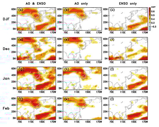 Correlation maps between observational SAT and SAT reconstructed from multiple regression based on (left column) AO and ENSO in (a) DJF mean, (d) December, (g), January, and (j) February. Center columns are the same as left column, but for SAT regressed on AO-only in (b) DJF mean, (e) December, (h), January, and (k) February. Right columns are the same as left column, but for SAT regression on ENSO-only in (c) DJF mean, (f) December, (i), January, and (l) February. Gray dots denote grid points which satisfy 95% confidence level through the two-tailed Student’s T-test.