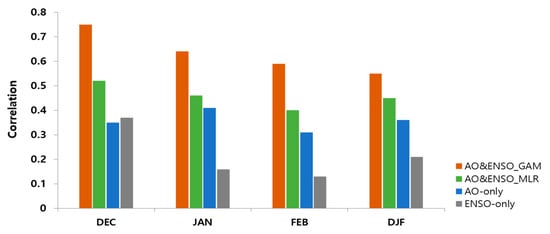 Moreover, in Figure 9, we can find that the consideration of both AO and ENSO better explains the SAT variability in South Korea than simply adding the influence of two climate modes. However, the influence of AO and ENSO over East Asia could be not purely linear additive, and nonlinear interaction between them could have a large influence. Some previous studies also argued that ENSO contributes substantially to AO-related circulation over the North Pacific in particular [33,34]. We examined the contribution of nonlinearity to SAT variability in South Korea using the general additive model (GAM), which can capture the nonlinearity in the data [42]. Comparing the correlation skill of GAM based on both climate factors and that of MLR (Figure 9), GAMs better explain the SAT variability than MLMs in all winter months. These results imply that the nonlinearity of the relationship between the SAT and both climate factors can contribute to SAT variability in South Korea considerably.
